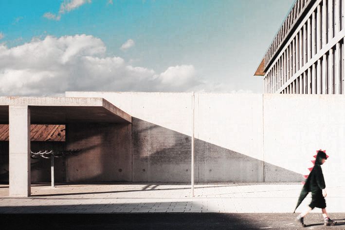 Durch die H-förmige Grundfigur des Gebäudes enstehen neben dem östlich vorgelagerten Pausenhof zwei geschütze Freibereiche nördlich und südlich der Pausenhalle. Der südliche Bereich wird als Musikhof genutzt.