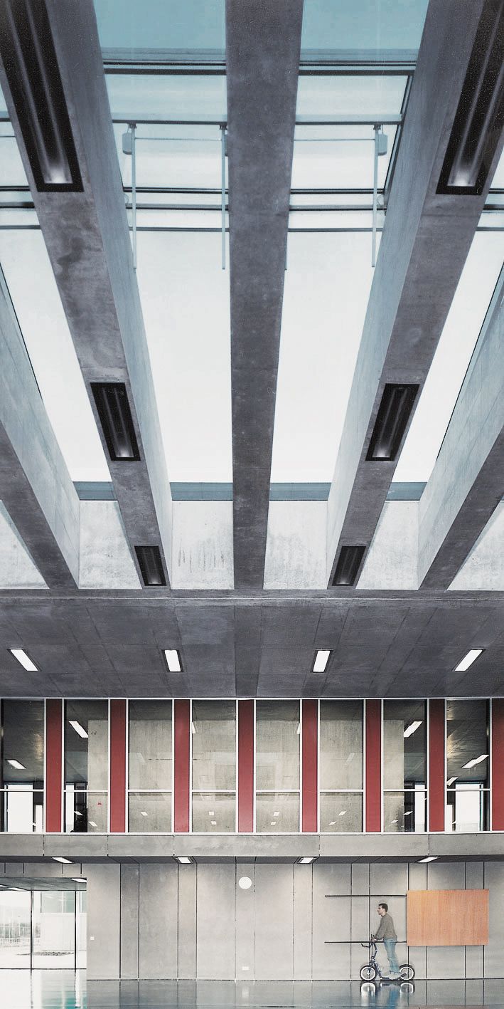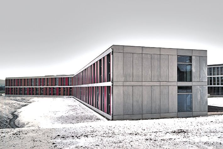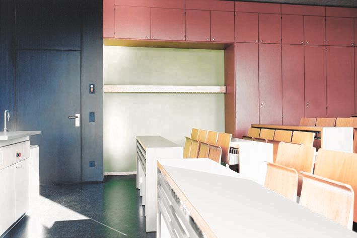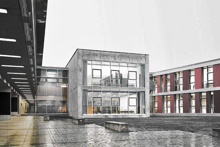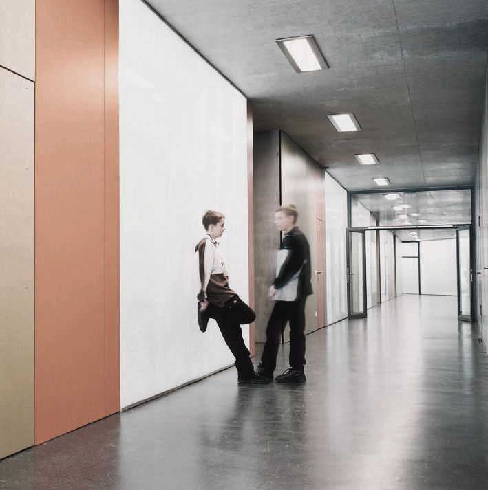 Die Schule gliedert sich in drei klar ablesbare Teilbereiche: in den im Osten liegenden Stammklassentrakt, den westlichen Fachklassenflügel mit Verwaltung und in die Pausenhalle, die die beiden Körper im Zentrum verbindet.