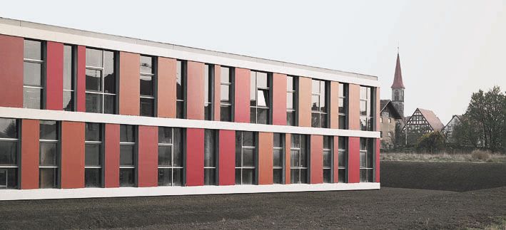 Der Stammklassentrakt ist teilweise aufgeständert, um dem Hauptzugang ein angemessenes Vorfeld zu geben und die Ost-Westquerung zu ermöglichen. Im Norden liegt dieser Bauteil auf einem künstlichen Geländefuß auf, der aufgrund des städtebaulichen Rahmenplans des Marktes Eckental als Schallschutzwall nach Norden verlängert werden soll.